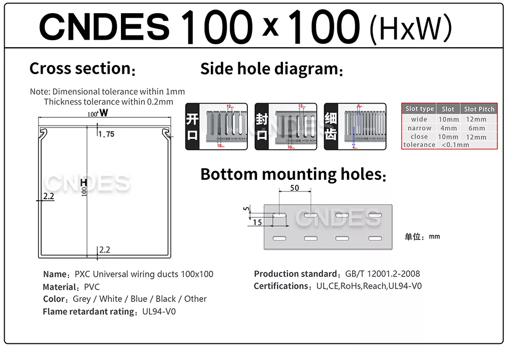 आमच्या सानुकूलित 100×100 वायर मॅनेजमेंट केबल डक्टसह तुमचे केबलिंग प्रकल्प ऑप्टिमाइझ करा. चीनमधील अग्रगण्य PVC केबल ट्रे निर्माता आणि पुरवठादार म्हणून, CNDES तुमच्या केबल व्यवस्थापनाच्या सर्व गरजांसाठी विश्वसनीय, उच्च-सुस्पष्टता आणि सानुकूल करण्यायोग्य उपाय प्रदान करते. आमच्याकडे वायर नलिका (केबल ट्रे) चे सर्व तपशील आहेत. आपल्याला इतर वैशिष्ट्यांची आवश्यकता असल्यास, कृपया आमच्याशी संपर्क साधा!