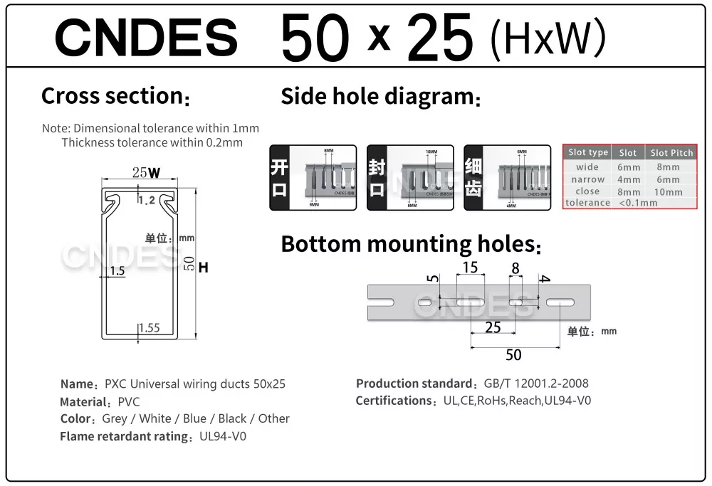 उच्च-गुणवत्तेच्या पीव्हीसी कच्च्या मालापासून बनविलेले, पर्यावरणास अनुकूल, ज्वाला-प्रतिरोधक आणि उच्च-शक्तीचे भौतिक गुणधर्म असलेले. तुम्ही आमच्या कारखान्यातून CNDES स्लॉटेड PVC इलेक्ट्रिकल कॅबिनेट डक्ट खरेदी करण्यासाठी निश्चिंत राहू शकता.