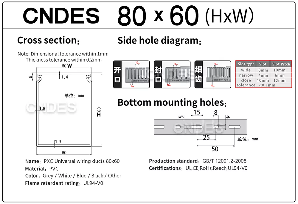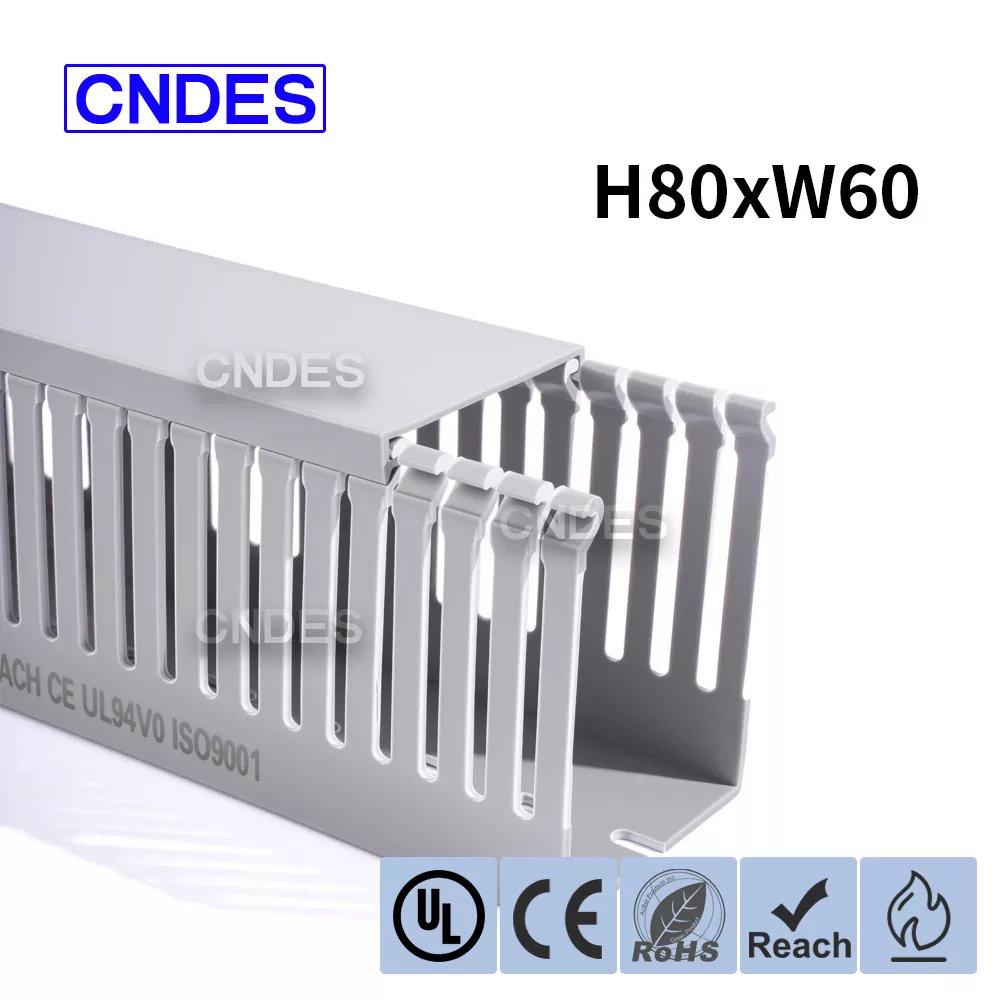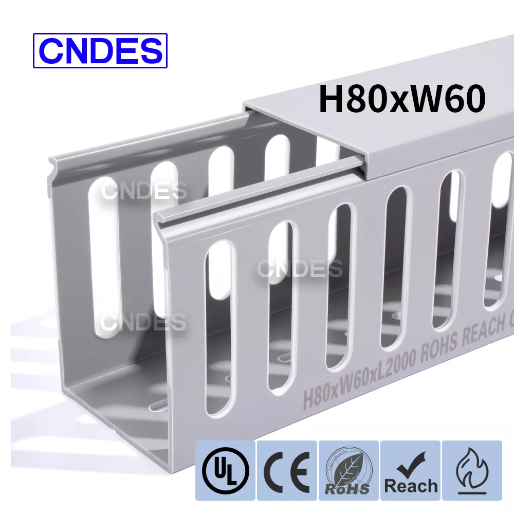 CNDES हे UL लिस्टेड स्लॉटेड PVC वायरिंग डक्ट उत्पादक आणि स्पर्धात्मक फॅक्टरी किंमतीसह पुरवठादार आघाडीवर आहे! या सानुकूलित 80×60 लिस्टेड स्लॉटेड PVC वायरिंग डक्टमध्ये वेगवान केबल रूटिंग, थ्रेडिंग आणि भविष्यातील देखरेखीसाठी दोन्ही बाजूंना समान अंतरावर असलेल्या खुल्या स्लॉटची वैशिष्ट्ये आहेत. केबलची क्षमता वाढवताना रुंद स्लॉटच्या कडा स्ट्रक्चरल कडकपणा वाढवतात. गोलाकार कडा स्थापनेदरम्यान हात किंवा वायर इन्सुलेशनचे नुकसान टाळतात. UL सूचीबद्ध स्लॉटेड PVC वायरिंग डक्टमध्ये सुरक्षित बंद सुनिश्चित करण्यासाठी आणि अपघाती उघडणे टाळण्यासाठी नॉन-स्लिप कव्हर समाविष्ट आहेत.